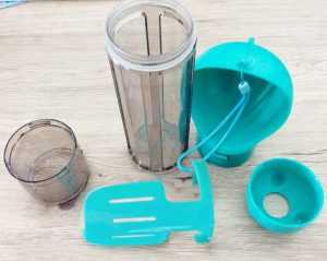 W środkowej, przezroczystej części mamy pojemnik na wodę. Odkręcamy, wlewamy wodę i zakręcamy. Podczas pojenia przyjaciela przesuwamy blokadę i woda leci do podajnika (miseczki).
